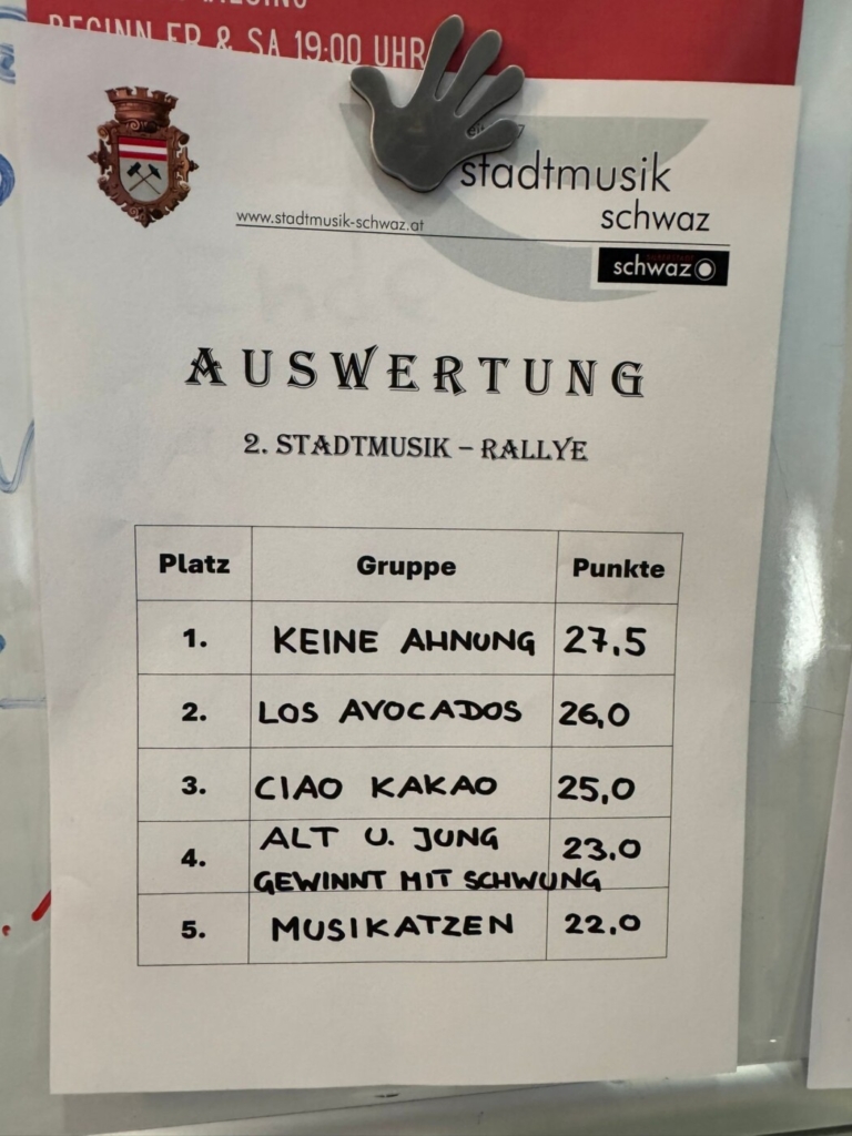 Am Samstag, den 9. August erlebten wir ein ganz besonderes Ereignis – die Stadtmusik-Rallye durch die Silberstadt Schwaz! Durch Zufall zusammengewürfelte Teams traten gegeneinander an, um in einem spannenden Wettkampf ihr Können unter Beweis zu stellen. An verschiedenen Stationen mussten Geschicklichkeitsspiele, Rätsel und Denkaufgaben gemeistert werden, die nicht nur musikalisches Wissen abfragten, sondern auch jede Menge Spaß, teilweise auch viel Schweiß und großes Gelächter mit sich brachten.
